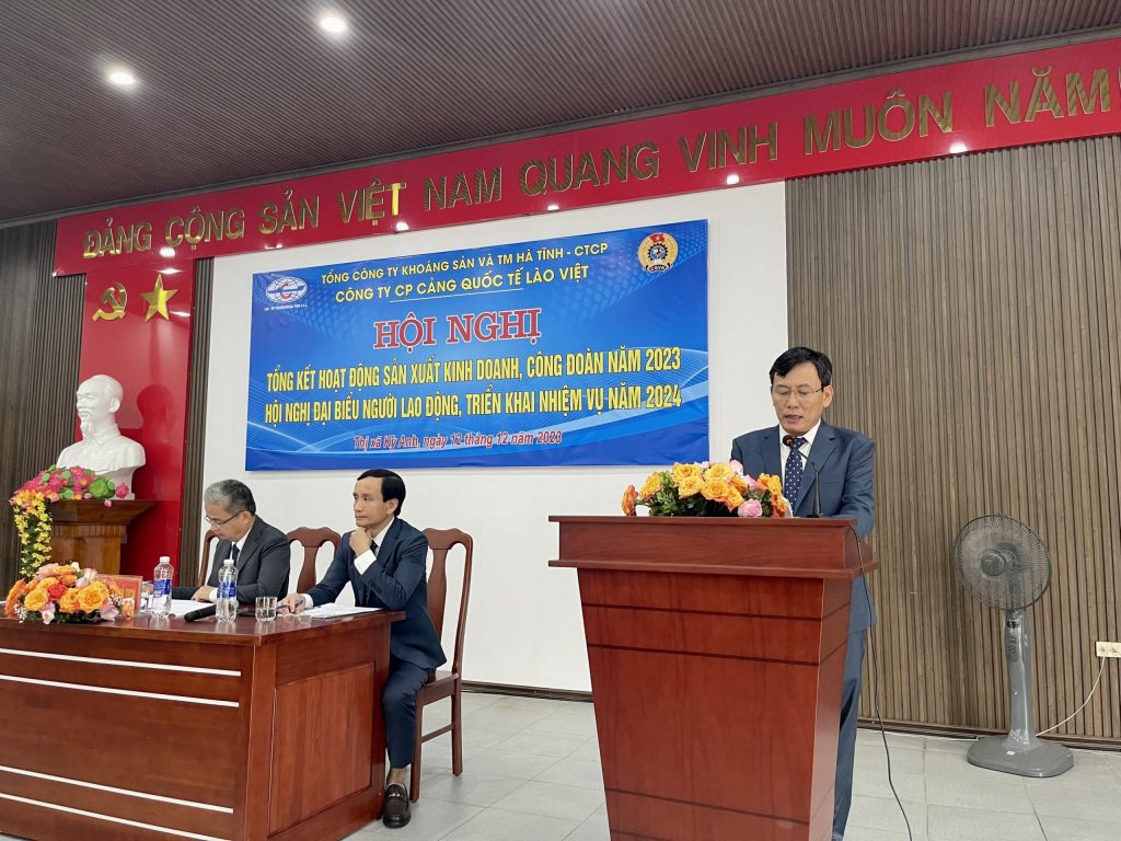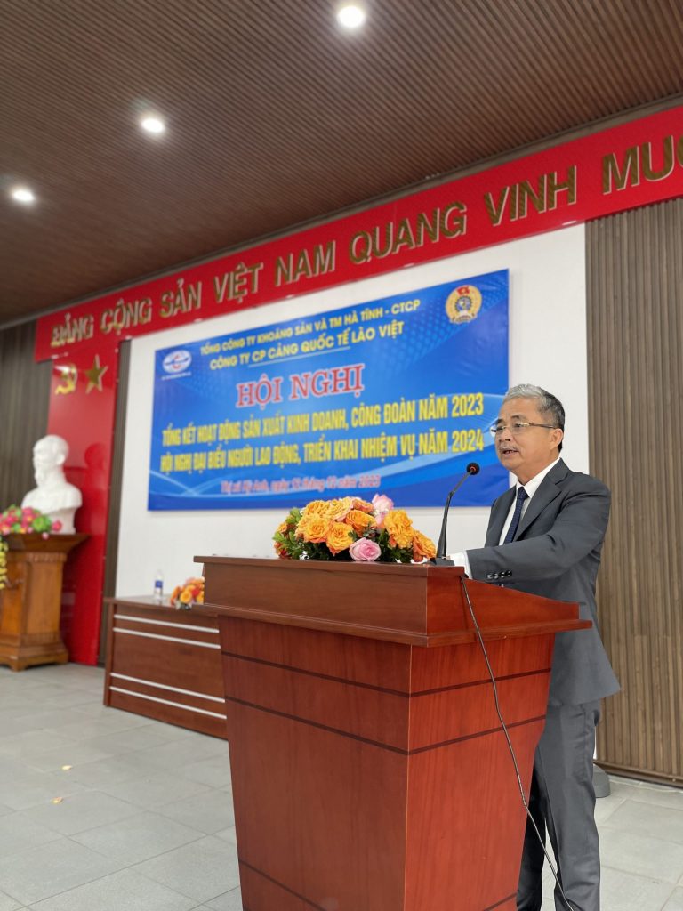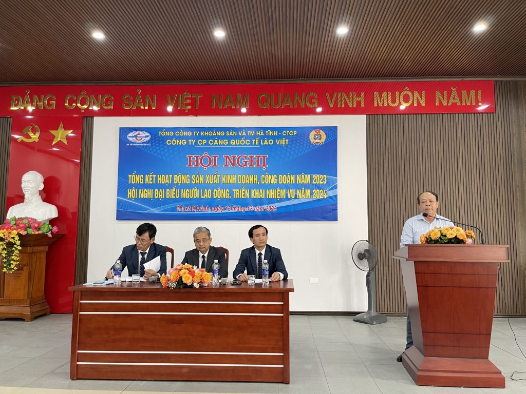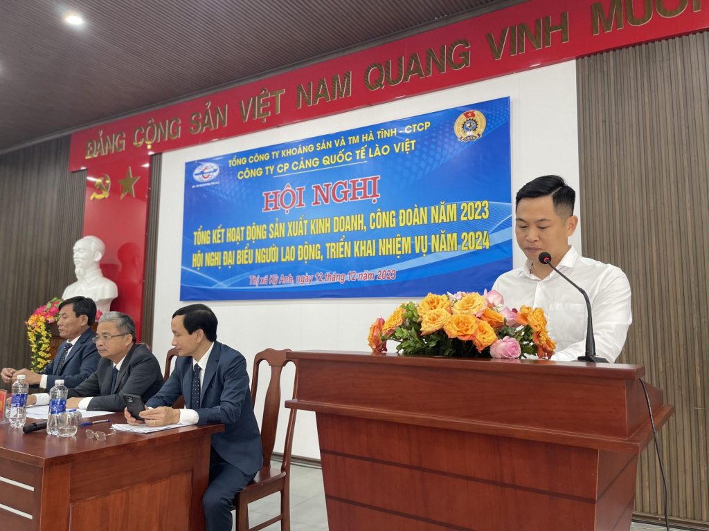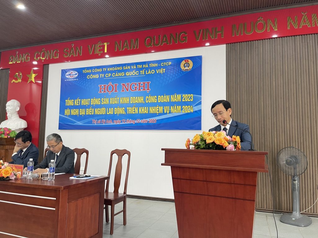 Thực hiện Chỉ thị số 422-CT/ĐU ngày 28/11/2023 của Ban Thường vụ Đảng ủy Tổng công ty Khoáng sản và Thương mại Hà Tĩnh về việc tổng kết công tác năm 2023 và triển khai nhiệm vụ năm 2024, được sự nhất trí của BCH Chi bộ, sáng ngày 12/12/2023 tại Hội trường Công ty CP cảng Quốc tế Lào - Việt, Công ty đã tổ chức hội nghị tổng kết hoạt động SXKD, Công đoàn năm 2023; Hội nghị đại biểu người lao động và triển khai nhiệm vụ năm 2024.