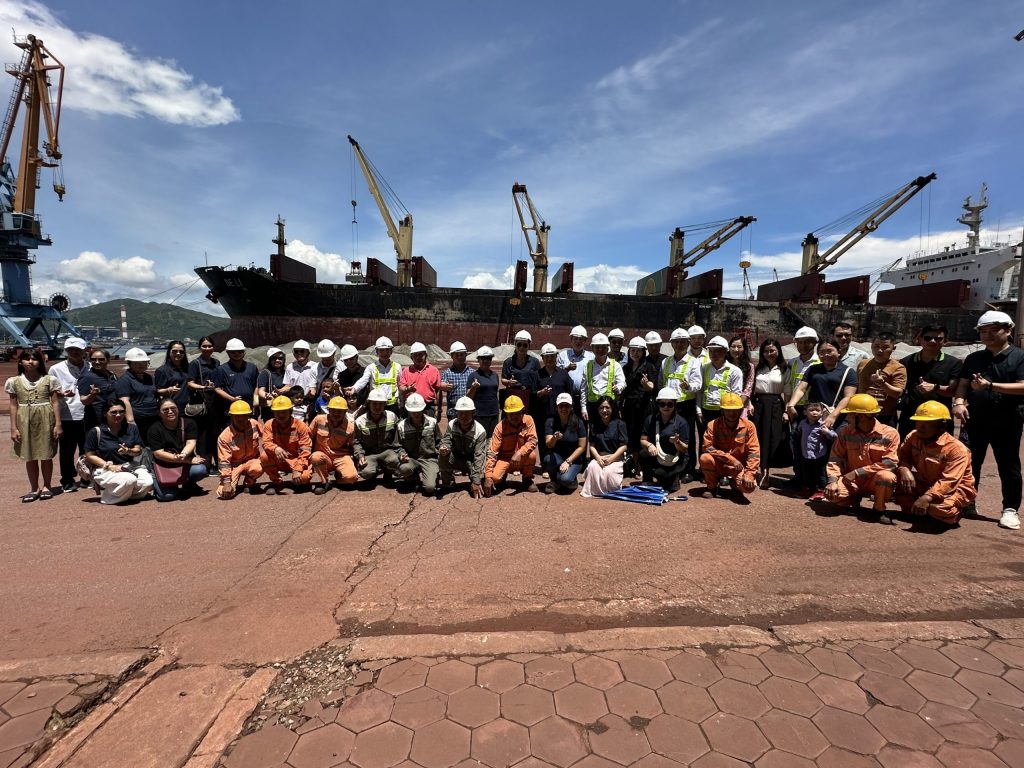 Đoàn công tác chụp ảnh lưu niệm cùng Ban lãnh đạo và người lao động Công ty VLP tại cảng Vũng Áng