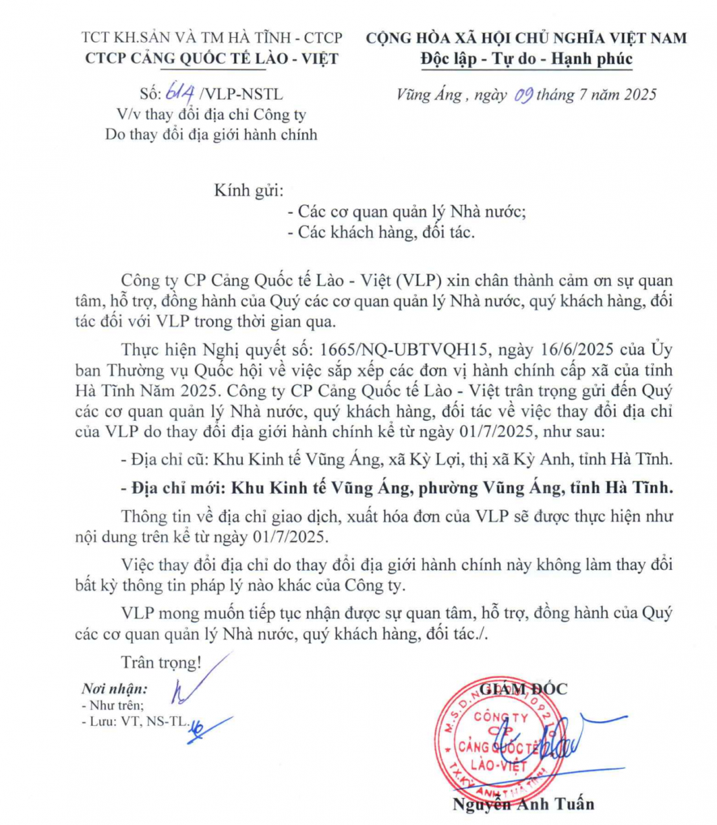 Thông báo về việc thay đổi địa chỉ của Công ty CP Cảng Quốc tế Lào - Việt