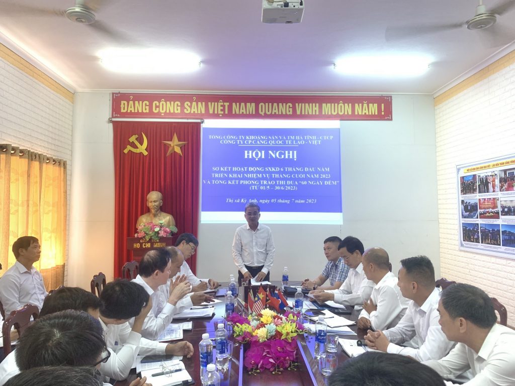Thực hiện thông báo số 400-TB/ĐU ngày 20/06/2023 của Đảng ủy Tổng công ty Khoáng sản và TM Hà Tĩnh về việc sơ kết công tác 6 tháng đầu năm, triển khai nhiệm vụ 6 tháng cuối năm 2023. Sáng ngày 05/7/2023 Công ty CP cảng Quốc tế Lào - Việt đã tổ chức hội nghị sơ kết hoạt động SXKD 6 tháng đầu năm, triển khai nhiệm vụ 6 tháng cuối năm 2023 và Tổng kết phong trào thi đua "60 ngày đêm”. Tham dự hội nghị có đồng chí Nguyễn Anh Thắng - Phó tổng giám đốc TCT khoáng sản và Tm Hà Tĩnh, Chủ tịch hội đồng quản trị Công ty cùng các đồng chí trong Ban Giám đốc Công ty, Trưởng, phó các phòng, ban, đơn vị, Chủ tịch Công đoàn, Bí thư ĐTN.