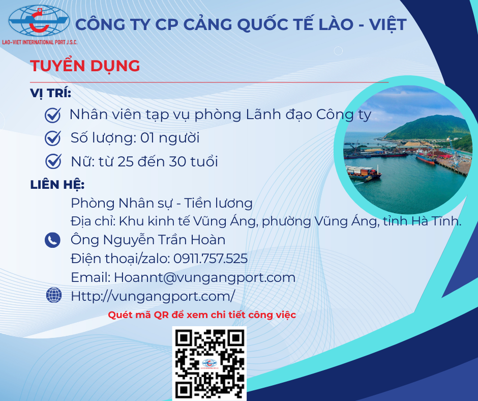 CÔNG TY CP CẢNG QUỐC TẾ LÀO - VIỆT THÔNG BÁO TUYỂN DỤNG LAO ĐỘNG Công ty CP cảng Lào - Việt thông báo tuyển dụng lao động XEM THÊM
