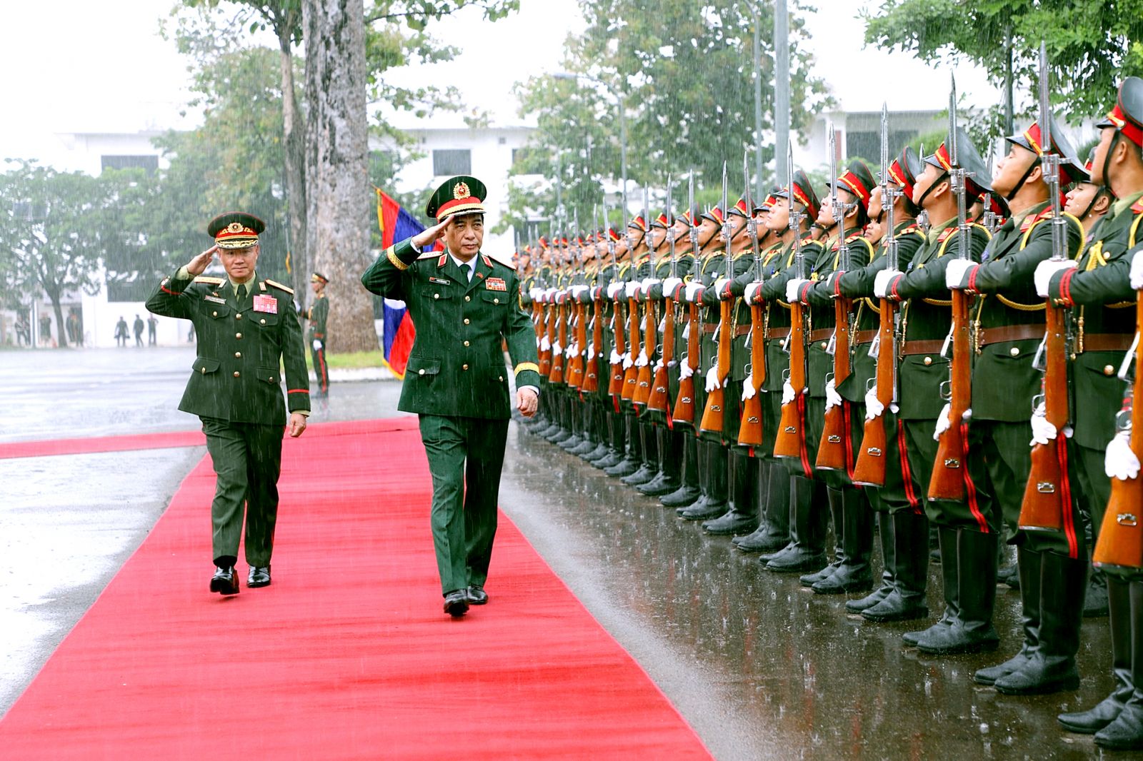 Thượng tướng Khamliang Outhakaysone và Đại tướng Phan Văn Giang duyệt đội danh dự tại lễ đón - Ảnh: THU TRANG