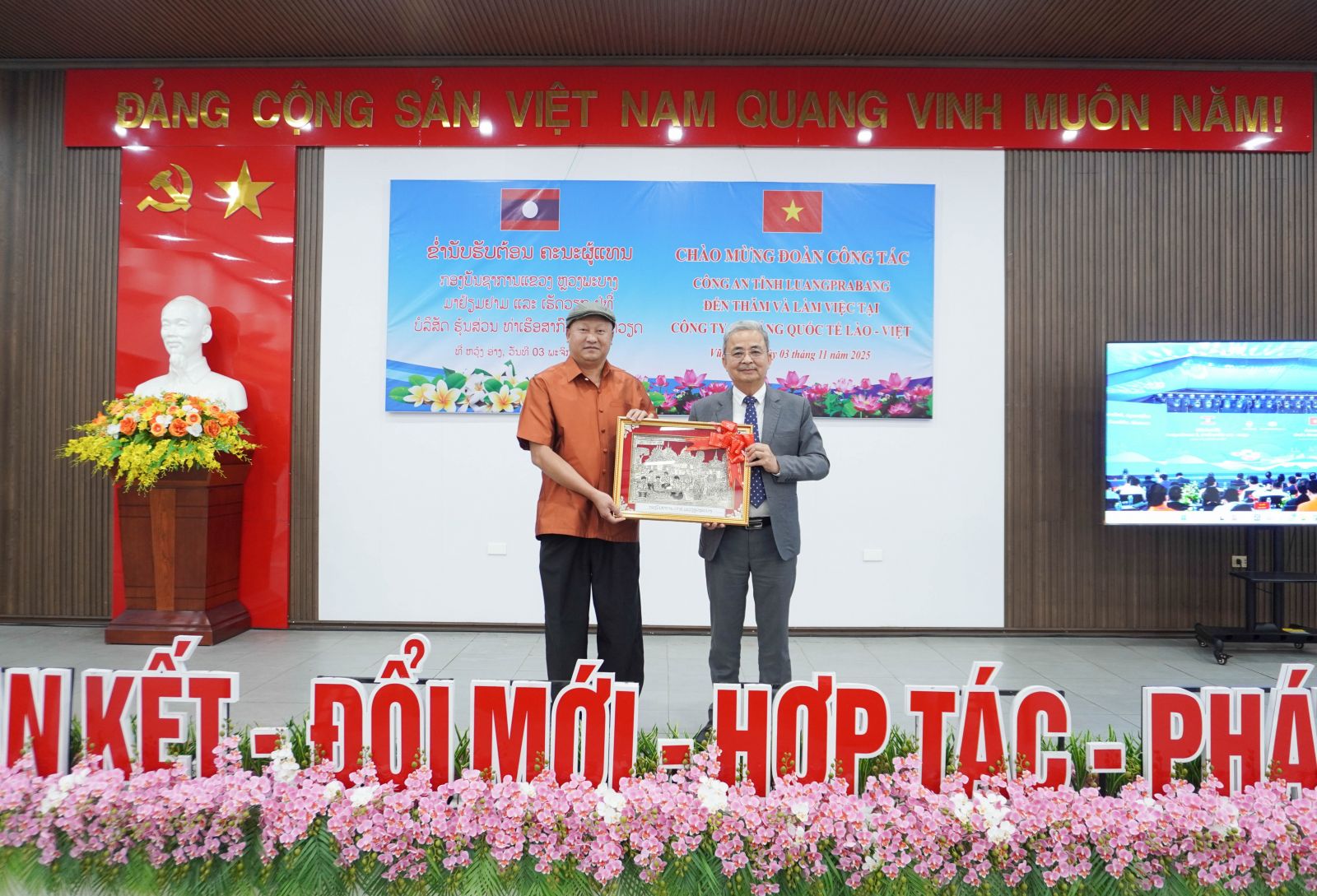 Chiều ngày 03/11, Công ty CP Cảng Quốc tế Lào - Việt vinh dự đón tiếp đoàn công tác Công an tỉnh Luông Phạ Bang nước CHDCND Lào do đồng chí Thiếu tướng Tù Xồng Pắt Cháy - Giám đốc Công an tỉnh làm trưởng đoàn. Về phía Công ty CP cảng Quốc tế Lào - Việt đón tiếp đoàn có ông Nguyễn Anh Tuấn - Giám đốc Công ty cùng cùng đại diện các phòng ban chức năng.
