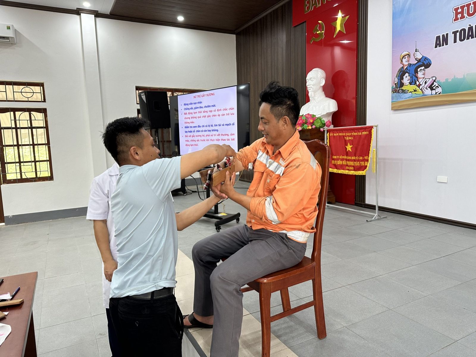 Học viên được hướng dẫn và thực hành các bước thao tác sơ cứu nhanh khi xảy ra TNLĐ