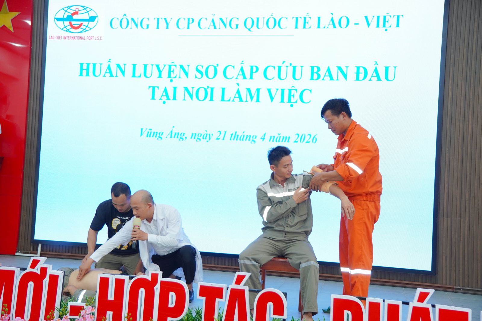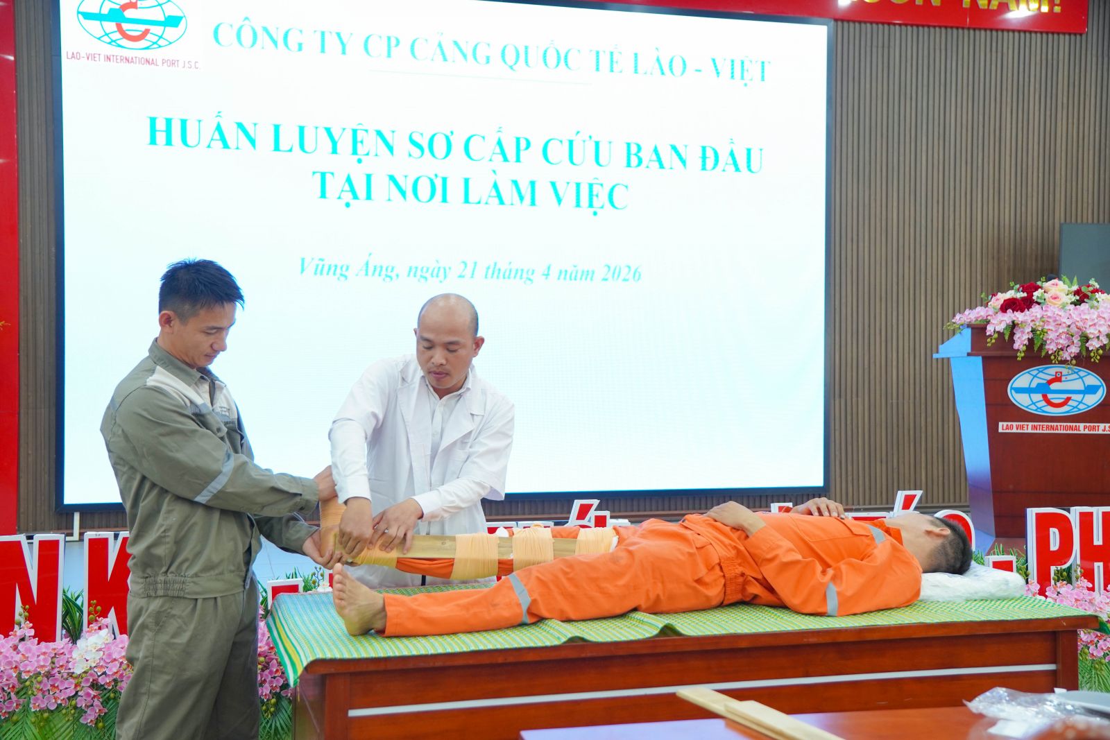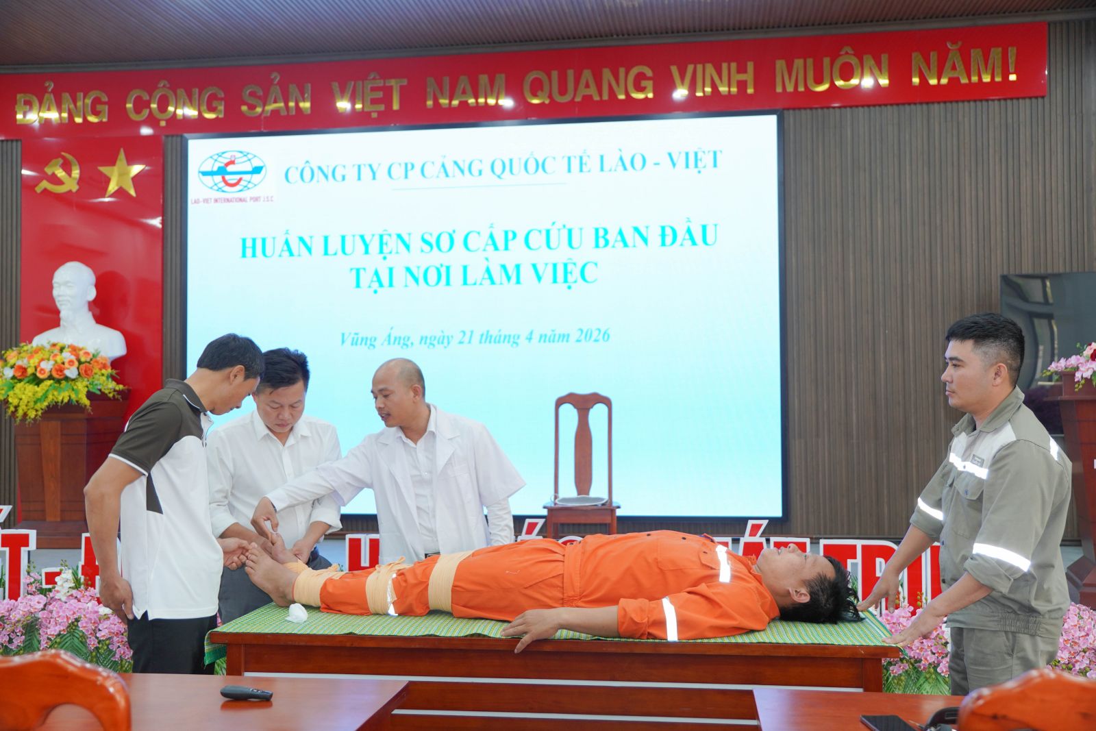 Nhằm nâng cao năng lực ứng phó với các tình huống khẩn cấp và đảm bảo an toàn, sức khỏe cho người lao động, Ngày 21/4/2026, Tại Hội trường Công ty, Công ty CP cảng Quốc tế Lào - Việt đã tổ chức chương trình huấn luyện sơ cấp cứu ban đầu cho người lao động.