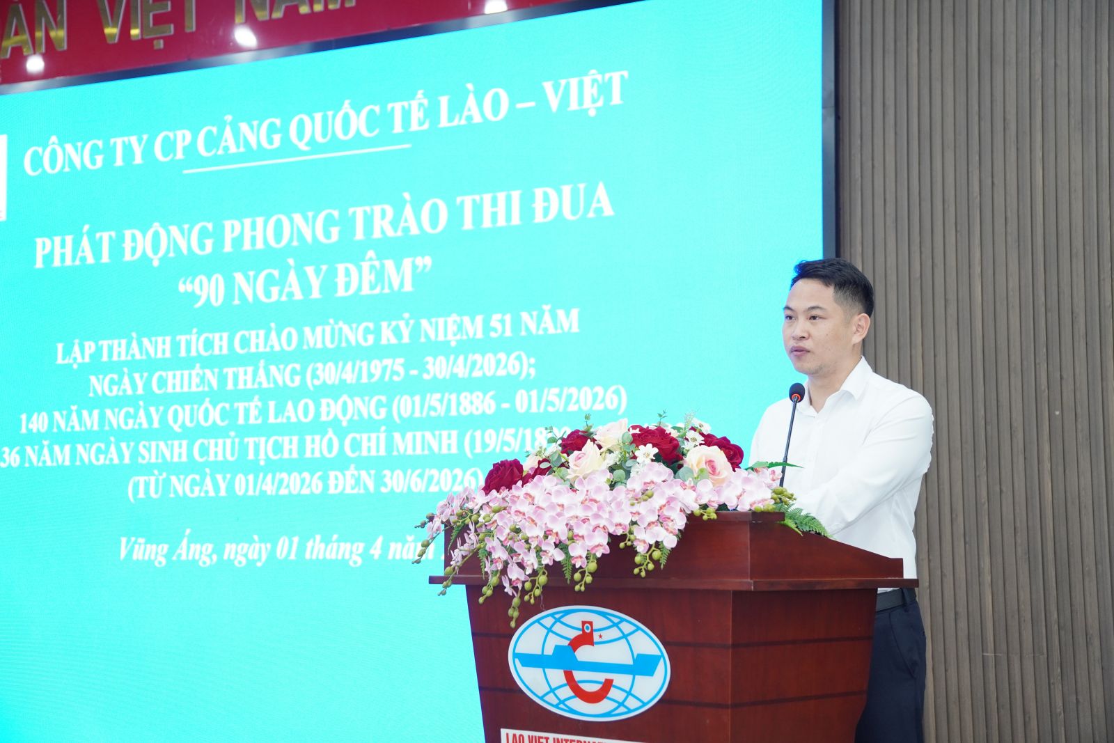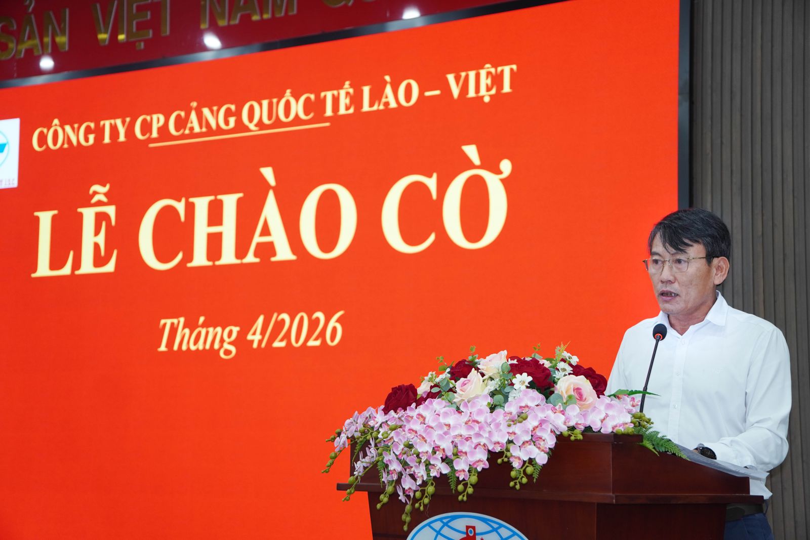 Sáng ngày 01/4, tại Hội trường, Công ty CP cảng Quốc tế Lào - Việt tổ chức Lễ chào cờ tháng 4 năm 2026 và Phát động Phong trào thi đua “90 ngày đêm” lập thành tích chào mừng Kỷ niệm 51 năm Ngày Chiến thắng (30/4/1975 - 30/4/2026); 140 năm Ngày Quốc tế Lao động (01/5/1886 - 01/5/2026) và 136 năm Ngày sinh Chủ tịch Hồ Chí Minh (19/5/1890 - 19/5/2026) (Từ ngày 01/4/2026 đến 30/6/2026). Tham dự buổi lễ có các đồng chí trong BCH Chi bộ, BGĐ Công ty, Trưởng, phó các phòng, ban, đơn vị, BCH Công đoàn, BCH Đoàn TN cùng toàn thể người lao động Công ty.
