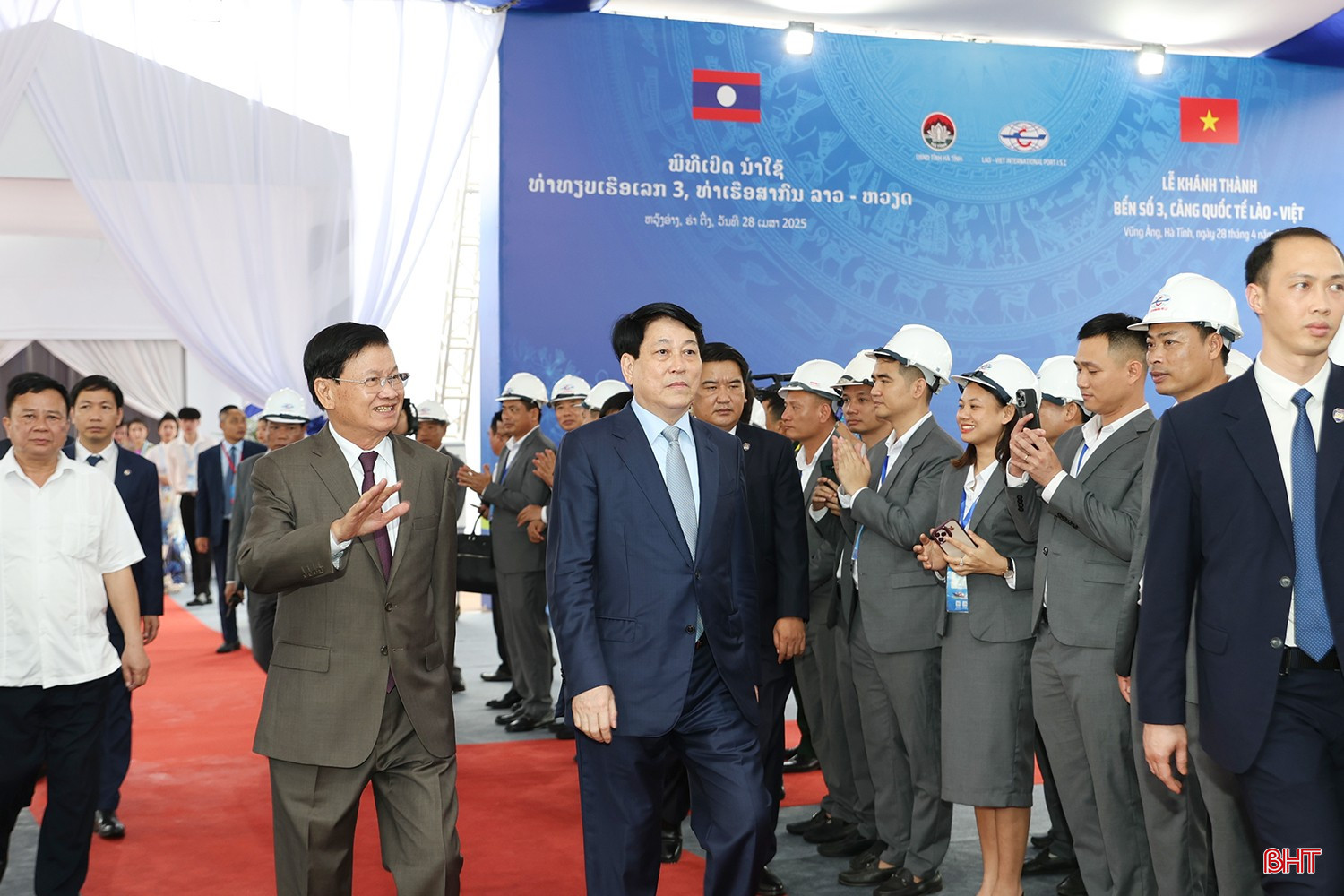 Đồng chí Thongloun Sisoulith - Tổng Bí thư BCH Trung ương Đảng, Chủ tịch nước CHDCND Lào và đồng chí Lương Cường - Chủ tịch nước CHXHCN Việt Nam dẫn đầu đoàn đại biểu cấp cao 2 nước tham dự Lễ khánh thành Bến số 3 Cảng quốc tế Lào - Việt.