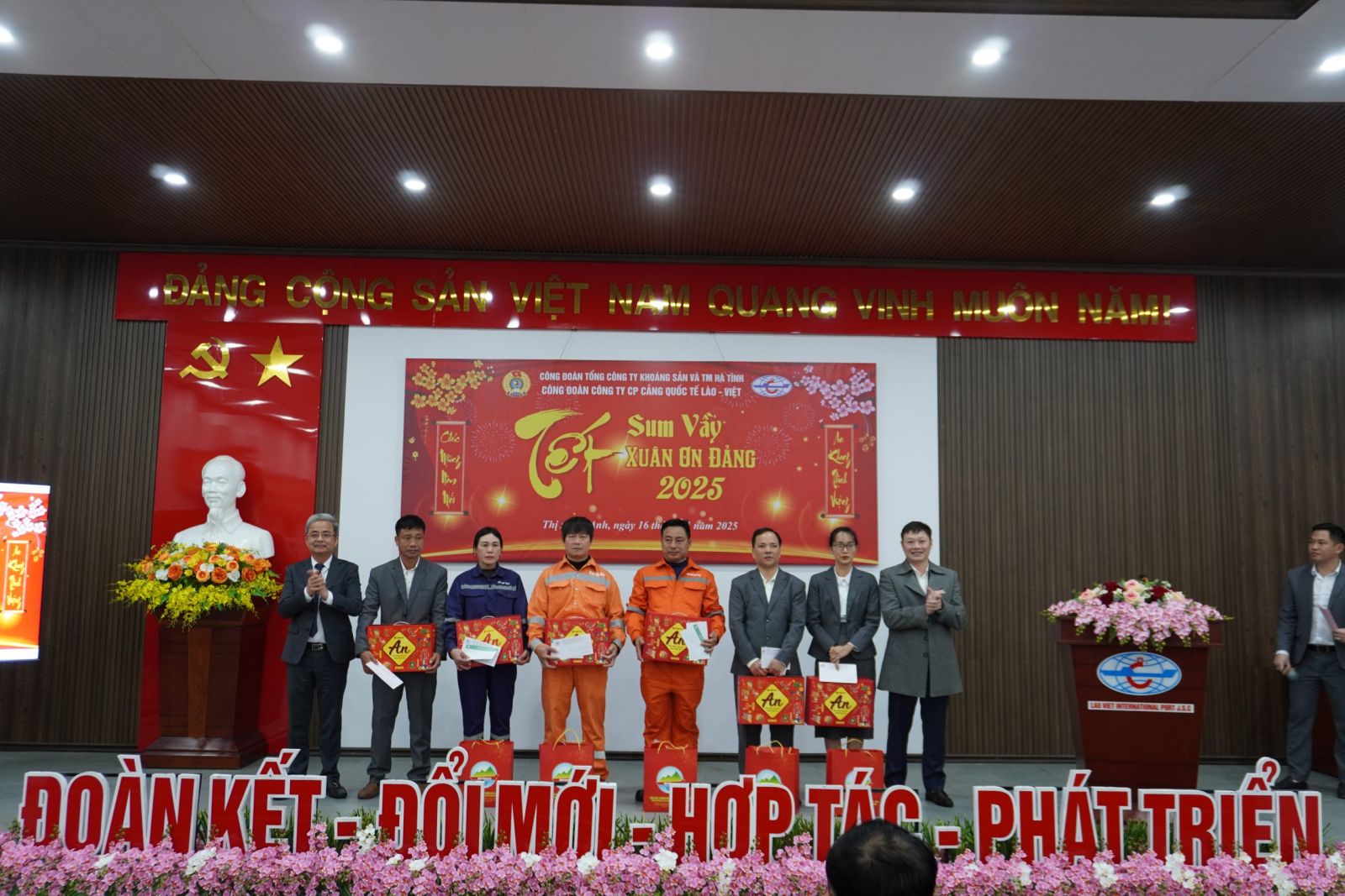 Chiều ngày 16/01/2025, Công ty VLP tổ chức chương trình “Tết sum vầy - Xuân ơn Đảng”. Tham dự có đ/c Võ Văn Lưu, UVBTV Đảng uỷ, Phó Tổng Giám đốc Tổng Công ty, Chủ tịch Công đoàn Tổng Công ty, Đ/c Nguyễn Anh Thắng, Phó Tổng Giám đốc Tổng Công ty, Chủ tịch HĐQT Công ty CP cảng Quốc tế Lào - Việt; các đ/c đại diện BTV Công đoàn Tổng Công ty, các phòng chuyên môn Tổng Công ty. Về phía Công ty CP cảng Quốc tế Lào - Việt có: Đ/c Nguyễn Anh Tuấn, Giám đốc Công ty; BCH Công đoàn, Đoàn Thanh niên; các đ/c trong Ban Giám đốc, trưởng, phó các phòng, ban, đơn vị và toàn thể người lao động Công ty.